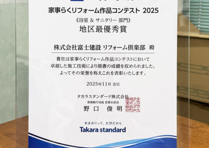 こんにちは、富士建設リフォーム倶楽部です。 このたび、当社が手がけた浴室リフォーム「大きな浴室大改修」が、 タカラスタンダード主催『家事らくリフォーム...