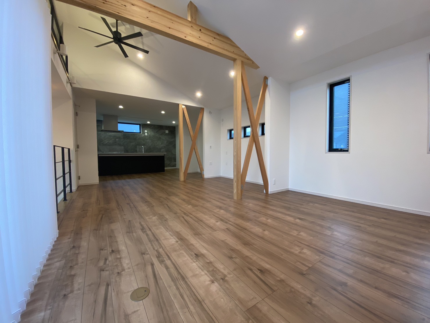 片流れ屋根のシックな外観に、木の梁が映える開放的なリビングが広がる住まい。畳スペースやロフト、充実した収納計画により、家族それぞれの暮らしを快適に支える工夫が詰まっています。