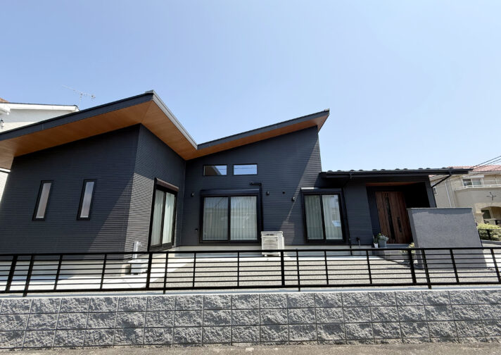 片流れ屋根のシックな外観に、木の梁が映える開放的なリビングが広がる住まい。畳スペースやロフト、充実した収納計画により、家族それぞれの暮らしを快適に支える工夫が詰まっています。
